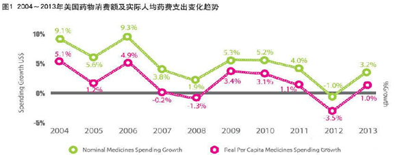美國(guó)是全球最大的醫(yī)藥市場(chǎng),全球醫(yī)藥市場(chǎng)的1/3來(lái)自美國(guó)。根據(jù)相關(guān)著名網(wǎng)站的藥物消費(fèi)數(shù)據(jù),2004~2013年的十年間,美國(guó)處方藥銷(xiāo)售額增長(zhǎng)放緩,2013年達(dá)到3292億美元,同比增長(zhǎng)3.2%(圖1)。