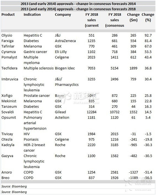 SGLT-2 抑制劑卡格列凈的市場在過去 12 個月繼續(xù)令人印象深刻,作為美國市場的一款一線藥物,其 2014 年全年的銷售預(yù)測從 2.61 億美元上升到 5.72 億美元,同時依魯替尼(獲批了多項新適應(yīng)癥)的強勁上市使其一致銷售預(yù)測從今年初的 2.2 億美元上升到目前的 4.85 億美元。相比之下,分析師相應(yīng)地按比例縮減了羅氏競爭藥物 Gazyva 的銷售預(yù)測。