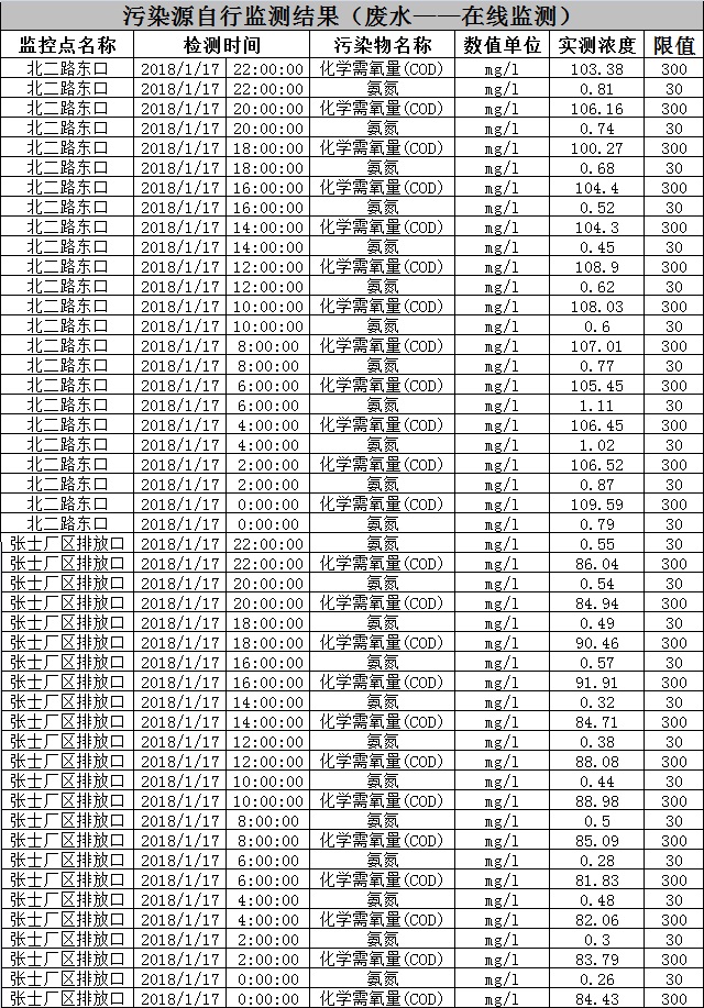 東北制藥集團(tuán)股份有限公司環(huán)境監(jiān)測數(shù)據(jù)-2018.01.17