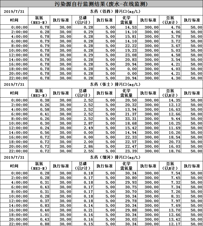 東北制藥集團(tuán)股份有限公司環(huán)境監(jiān)測數(shù)據(jù)-2019.7.31