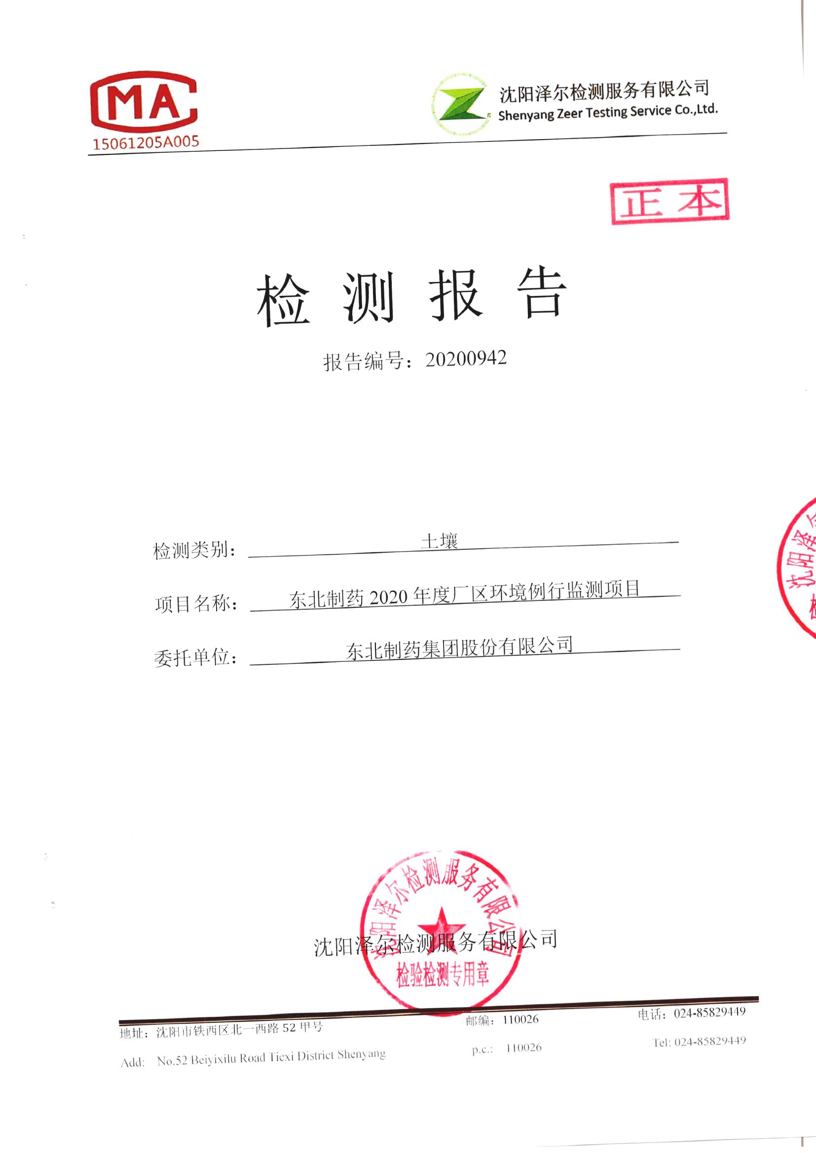東北制藥集團(tuán)股份有限公司細(xì)河廠區(qū)2020年度土壤監(jiān)測報告